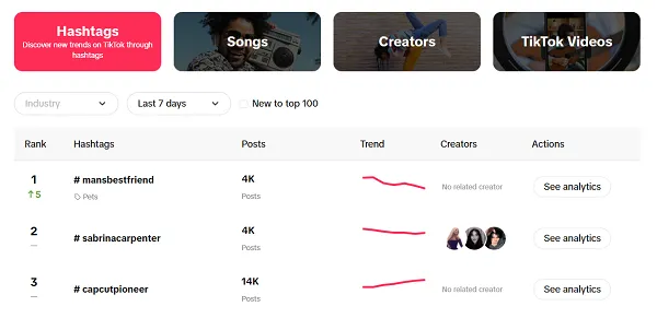 Dùng công cụ xu hướng của TikTok để xem hashtag theo ngành, loại nội dung + creator/trend nào đang lên. Từ đó định hướng ý tưởng sáng tạo và style video để phù hợp với nhóm tuổi trẻ.