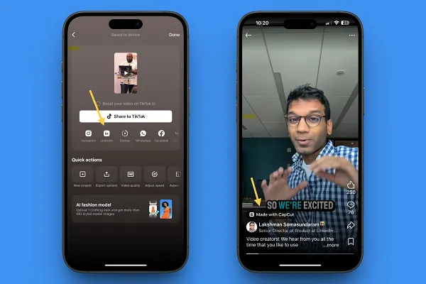 Người dùng CapCut giờ có thể xuất video và đăng lên LinkedIn chỉ với vài cú chạm, không cần xuất file rồi upload thủ công. Video đăng lên sẽ hiển thị dòng “Made with CapCut” phía trên phần mô tả, nhưng không bị ảnh hưởng tới thứ hạng nội dung.