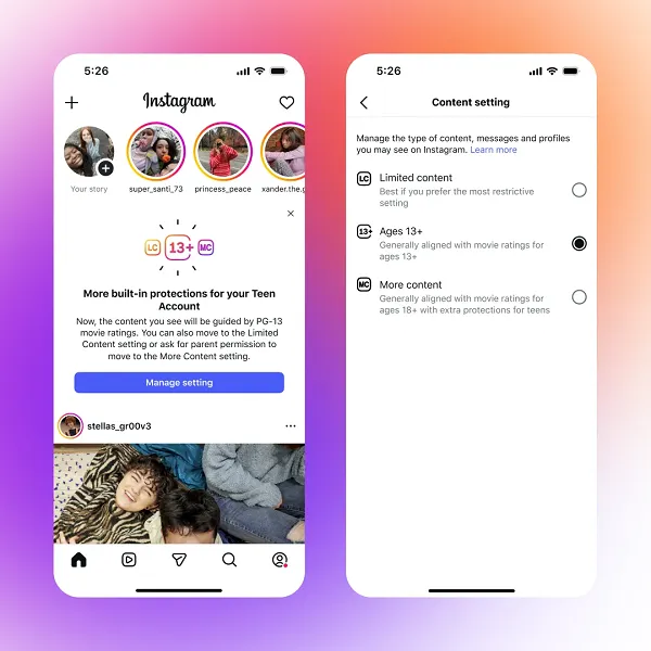 - Trong các đề xuất (Explore, Reels, feed, Stories, bình luận), Instagram sẽ hạn chế hiển thị các nội dung không phù hợp theo tiêu chuẩn PG-13 — kể cả khi người bạn theo dõi chia sẻ nội dung đó.