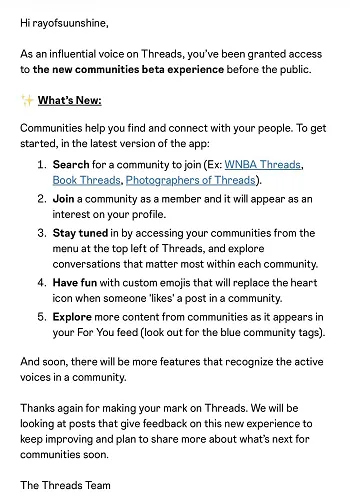 - Threads đã gửi email mời cho một số creators / người dùng được chọn để tham gia các cộng đồng theo chủ đề.